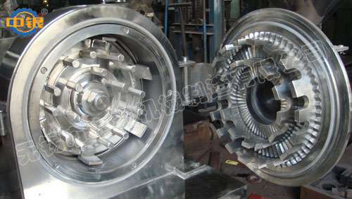 萬能粉碎機利用活動齒盤和固定齒盤見的高速相對運動,使被粉碎物經齒沖擊,摩擦及物料彼此間沖擊等綜合作用獲得粉碎。本機結構簡單、堅固、運轉平穩、粉碎效果良好,被粉碎物可直接由主機磨腔中排出、粒度大小通過更換不同孔徑的網篩獲得,另外該機為全不銹鋼。機殼內壁全部經機加工達到表面平滑,改變了以前機型內壁粗糙、積粉的現象,使藥品、食品、化工等生產更符合國家標準,達到GMP的要求。